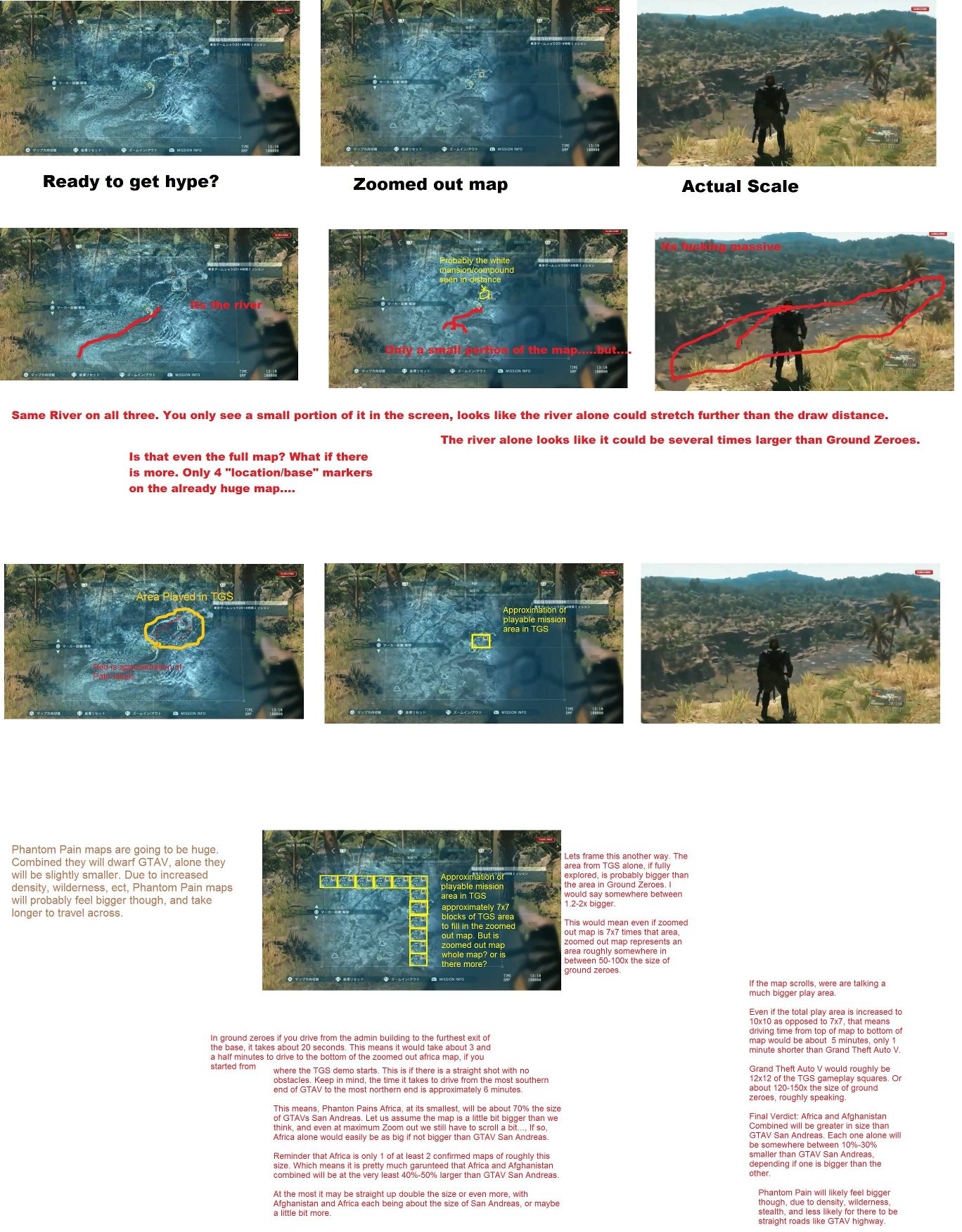 Bajo estos párrafos tenéis una imagen en la que se compara el tamaño del mapa de Metal Gear Solid 5 The Phantom Pain (con zoom y sin zoom) con las zonas en las que se lleva a cabo una misión en la demo del Tokyo Game Show 2014 y se especula con las dimensiones finales, considerando que habrá más localizaciones que Afganistán en las que transcurrirá la aventura de Big Boss, usando las dimensiones de Los Santos de GTA V como baremo… pese a que son juegos muy distintos y tampoco tiene mucho sentido. Aun así, tiene su mérito el razonamiento.