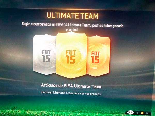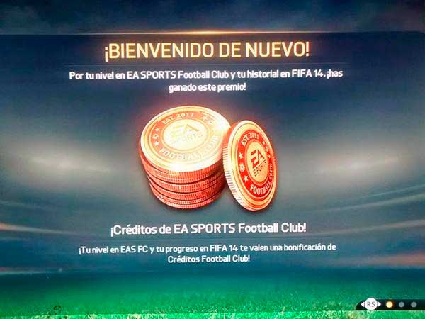 Con un mensaje de «Bienvenido de nuevo», nos hemos encontrado con un premio en FIFA 15. Este nos obliga, eso sí, a haber jugado antes a títulos como el del mundial o FIFA 14, una vez registrados en los servidores de EA. Nuestro historial sirve para esto.