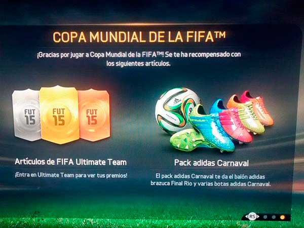 Por jugar a Copa Mundial de la FIFA recibiremos la recompensa de varios artículos en FIFA Ultimate Team. Una exclusiva en las consolas de Microsoft, que se acompaña con un pack Adidas Carnaval. Este incluye el balón Adidaas Brazuca Final Rio y varias botas Carnaval. Todo muy colorido y relacionado con el último campeonato mundial.